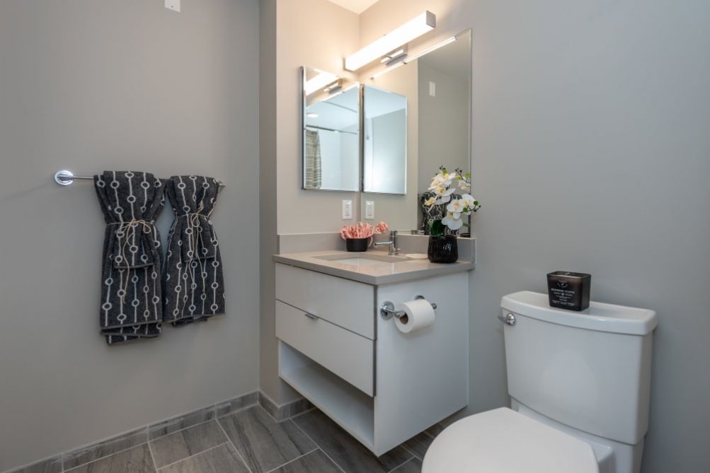 • Wall-Hung Vanities With Quartz Countertops